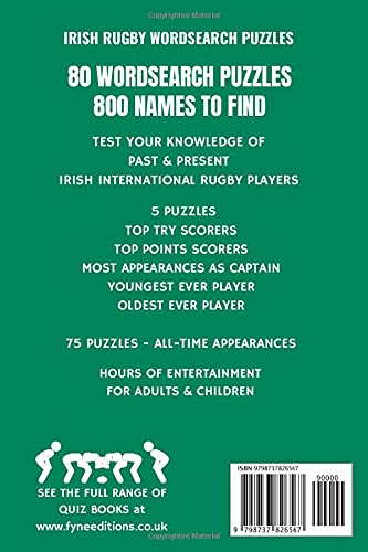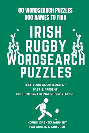 This fantastic book contains a total of 80 word search puzzles containing the names of Irish International rugby players from the past and present. See if you can find the 800 Irish Rugby team’s legends and today’s rising stars!