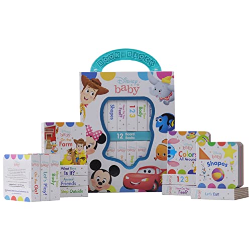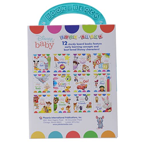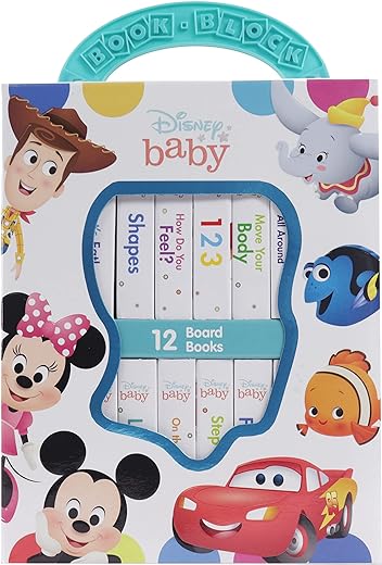 Your little one will love to learn with classic and modern Disney and Pixar characters from Disney Baby! The library includes 12 sturdy board books – the perfect size for little hands – with early learning content including words, numbers, shapes, feelings, and more. All the books are housed in a durable, colorful case with convenient handle so you can take your book set with you on the go and share hours of entertainment and learning!