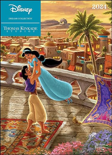 The Disney Dreams Collection by Thomas Kinkade Studios 2024 Engagement Calendar lays flat when open to any page and contains over 50 images of your favorite Disney characters as well as monthly and weekly planning pages to keep track of appointments, deadlines, and special occasions.