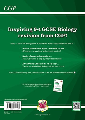 This superb Revision Guide is the perfect companion to Grade 9-1 AQA GCSE Biology (Higher level). The entire course is explained clearly and concisely, with brilliant coverage of the required practicals, maths skills and Working Scientifically, all in CGP’s bold ‘no-nonsense’ style. Each page is rounded off with practice questions to help cement what students have learned, with answers at the back of the book. QR codes throughout give quick and easy access to worked video solutions from our in-house experts, plus an unbeatable online Knowledge Retrieval quiz – designed to be played again and again to make all those facts stick. We’ve even thrown in a heap of info on “What to Expect in the Exams” available to view online. Redeem the code inside the book for a free Online Edition to read on your PC, Mac or tablet. When the book arrives, just use the unique code printed inside the cover to gain full access. For the perfect revision combo, check out our matching AQA GCSE Biology Higher Level Exam Practice Workbook (9781782944928).