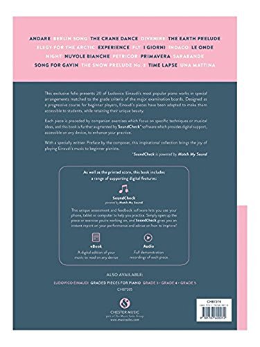 (Music Sales America). This exclusive folio presents 20 of Ludovico Einaudi’s most popular piano works in special arrangements matched to the grade criteria of the major examination boards. Designed as a progressive course for beginner players, Einaudi’s pieces have been adapted to make them accessible to students, while retaining their unique beauty. Each piece is preceded by companion exercises which focus on specific techniques or musical ideas, and this book is further augmented by SoundCheck* software which provides digital support, accessible on any device, to enhance your practice. With a specially written Preface by the composer, this inspirational collection brings the joy of playing Einaudi’s music to beginner pianists. *SoundCheck is powered by Match My Sound