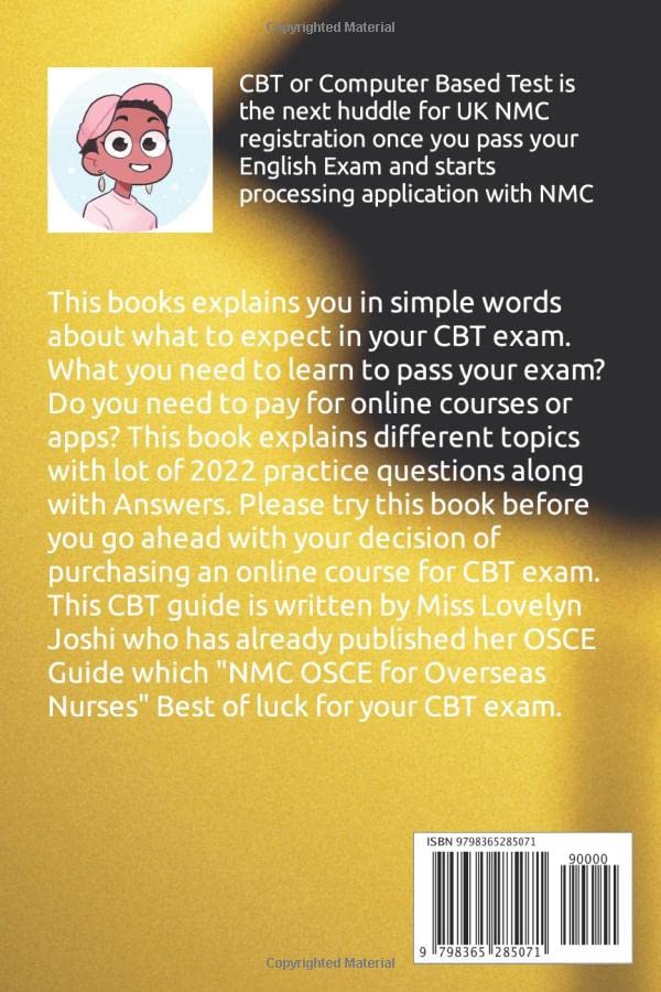 Once you pass your English language test such as OET/IELTS, CBT is the next step that follows in getting your dream job in United Kingdom. CBT is computer based test conducted as Part 1 of NMC Test of Competence. Part 2 of NMC Test of Competence is OSCE. This book is exclusively prepared for all the overseas nurses who are attempting NMC CBT in 2022. The book gives you an idea of what to expect in your CBT exam along with practice questions which will help you pass your CBT in first attempt. There is no need to join any online training classes for CBT exam. This book will help you clear NMC CBT in first attempt itself. This book is authored by Miss Lovelyn Joshi who has already proved her academic excellence by publishing NMC OSCE for Overseas Nurses (OSCE Guide).