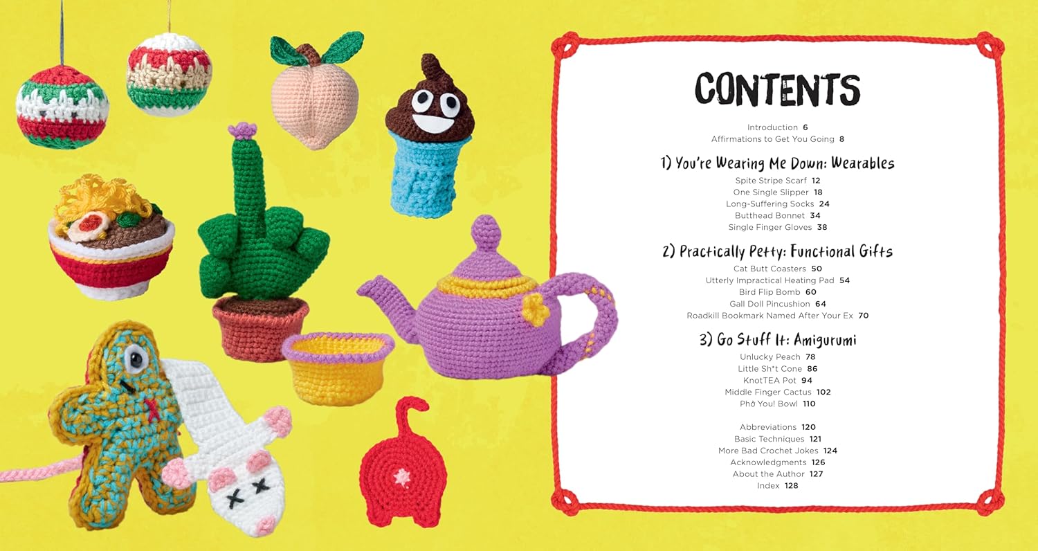 - 15 cheeky patterns, including the Middle Finger Cactus, Spite Stripe Scarf, Cat Butt Coasters, and more!