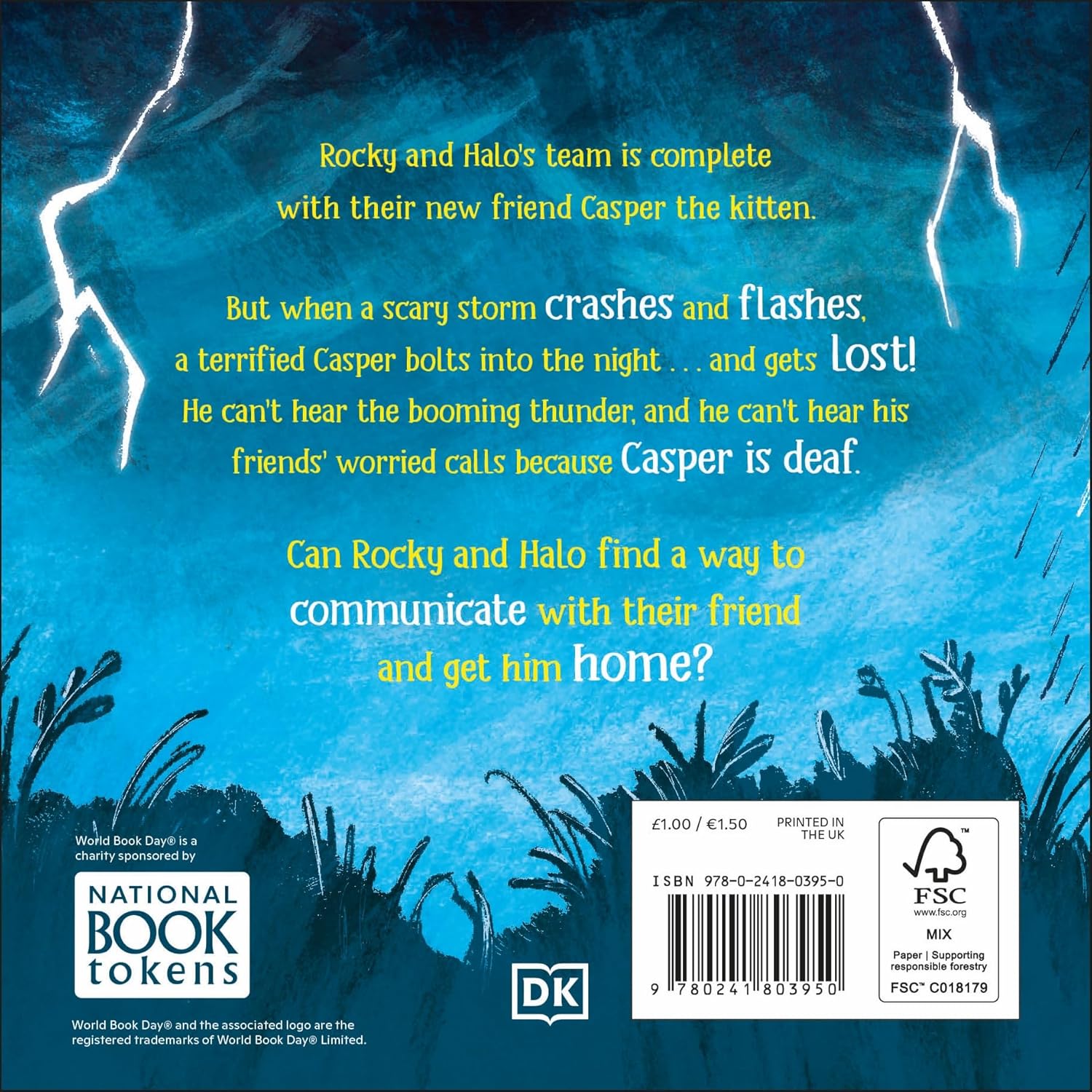 When a noisy storm scares Halo and Rocky, Casper remains calm. But when lightning flashes, Casper dashes off, and the other kittens realise he is deaf! Can Halo and Rocky be brave, find Casper, and learn a new way to communicate with their friend?