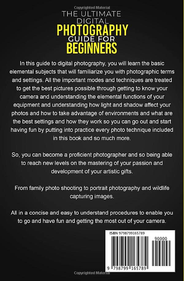 In this guide to digital photography, you will learn the basic elemental subjects that will familiarize you with photographic terms and settings. All the important modes and techniques are treated to get the best pictures possible through getting to know your camera and understanding the elemental functions of your equipment and understanding how light and shadow affect your photos and how to take advantage of environments and what are the best settings and how they work so you can go out and start having fun by putting into practice every photo technique included in this book and so much more.