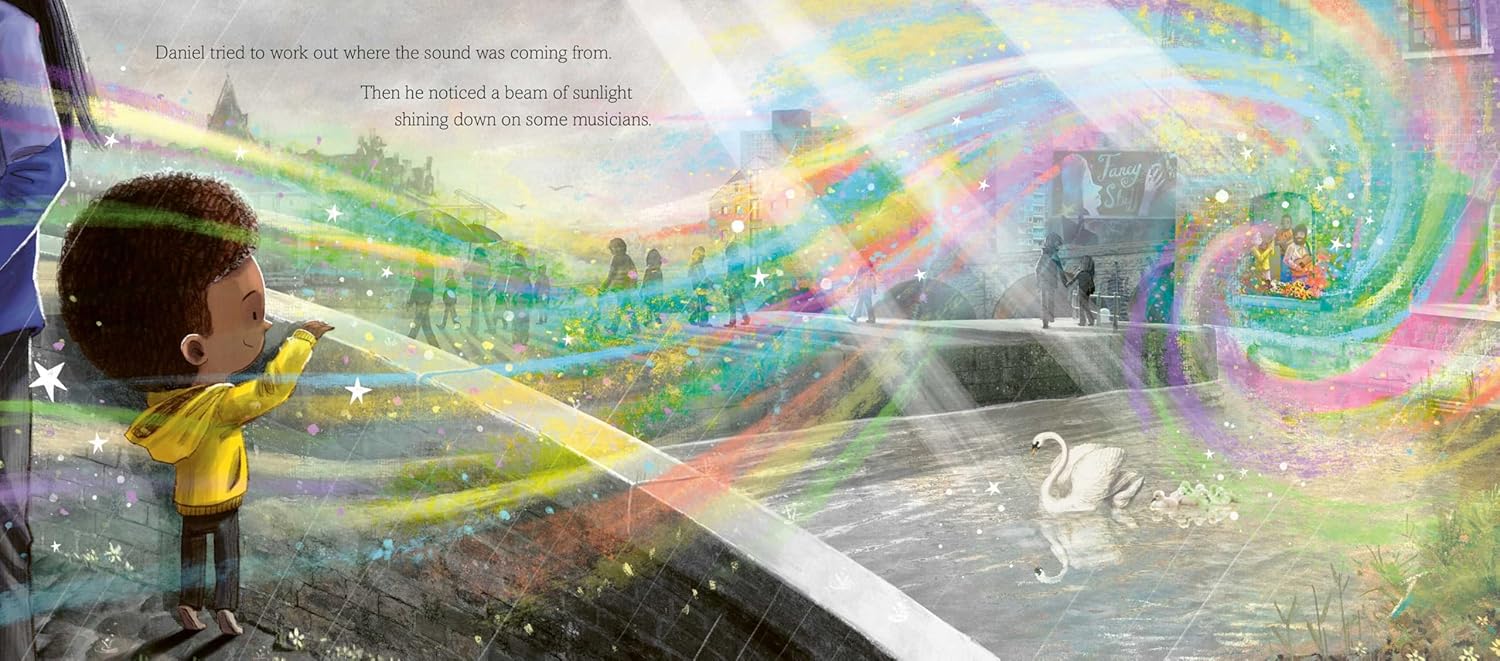 Daniel is having a terrible day. From the rain that tumbles down from the dark, grey skies to the puddles that soak his shoes, Daniel’s convinced that nothing will lift his mood. But everything changes when he hears the sweet, delicate sound of music, barely audible beneath the rain. Perhaps, if he looks carefully enough, Daniel might find that there are moments of joy and wonder that can brighten even the darkest of days . . .