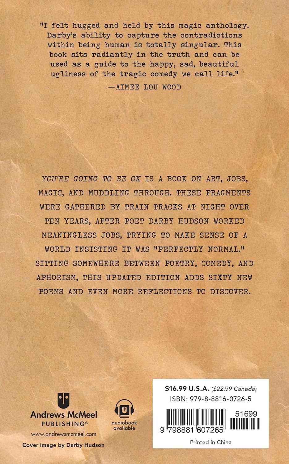 You’re Going to Be OK is a book on art, jobs, magic and muddling through. These hand-typed fragments were gathered by the train tracks at night over ten years, after author Darby Hudson worked meaningless jobs, trying to make sense of a strange world that insisted it was “perfectly normal.” The observations in You’re Going to Be OK are little fragments of collected wisdom that sit somewhere between poetry, comedy and aphorism. With sixty new poems, this updated edition includes even more of Hudson’s reflections to enjoy.